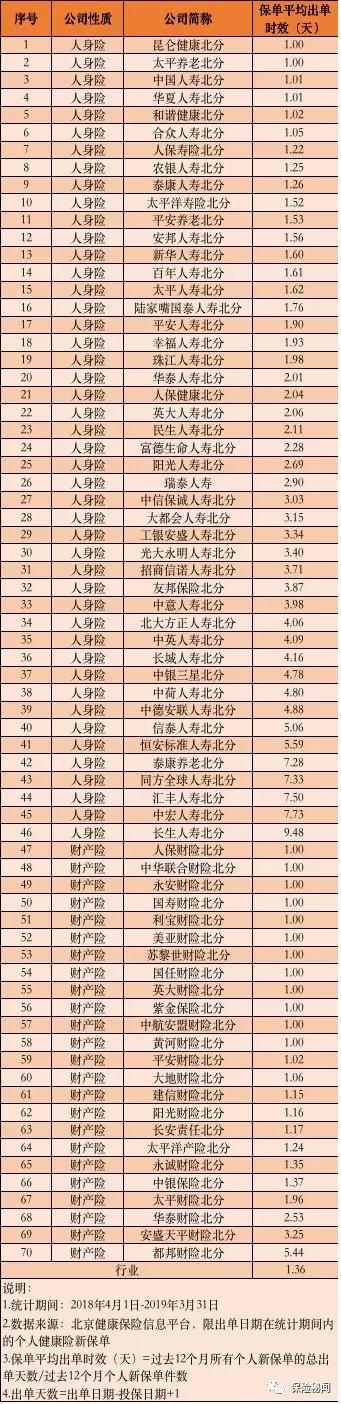 在北京地区的46家人身险公司中,多数公司能在一周内出单,其中昆仑健康北分、太平养老北分保单平均出单时效最快,仅为1天。