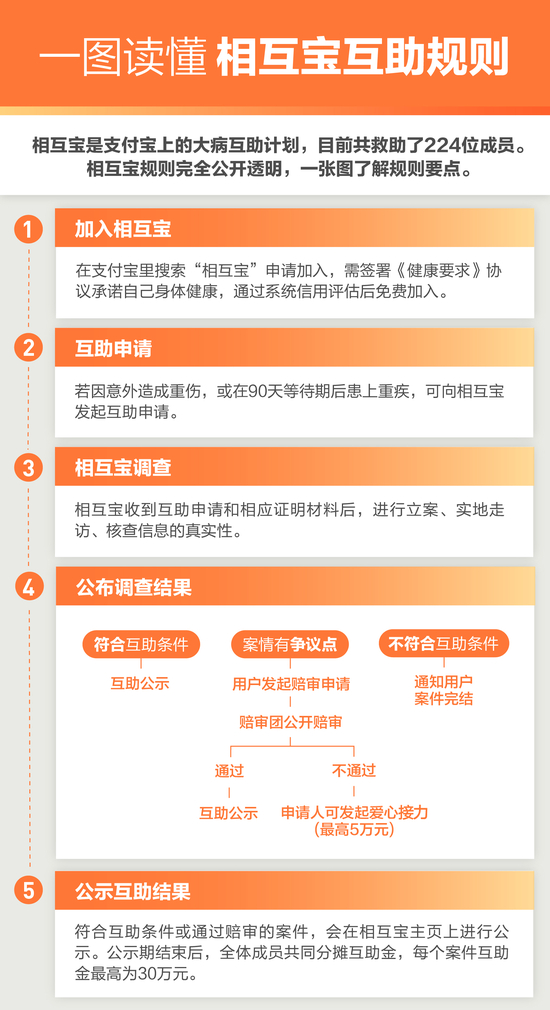 相互宝同时还宣布,上线爱心接力功能,让赔审失败的申请人可以多一种获得帮助的途径。