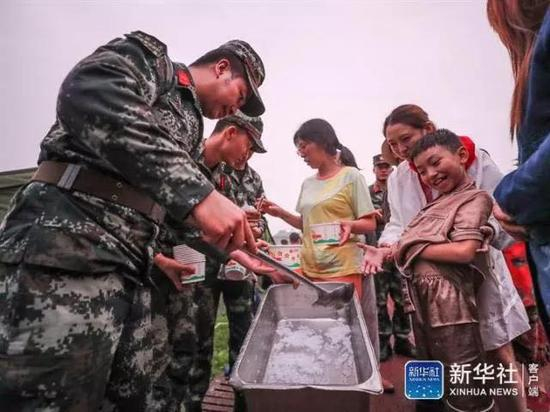 6月18日早晨,在双河中学外操场,武警部队官兵们在为群众发放早餐。