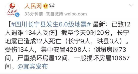 据人民网报道,截至18日9时20分,四川长宁6.0级地震已造成12人死亡(长宁9人,珙县3人)。受伤134人,集中安置4298人;倒塌房屋73间,严重损坏房屋12间,一般损坏房屋10657间。
