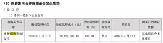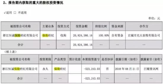 年报同时显示,其于2018年4月12日从宜城市光大农牧有限公司手中购得浙江恒诚保险经纪有限公司100%的股权,代价是2082.44万元,在这一天,其也完成了原保监会的备案变更手续,正式成为该保险经纪公司唯一股东。