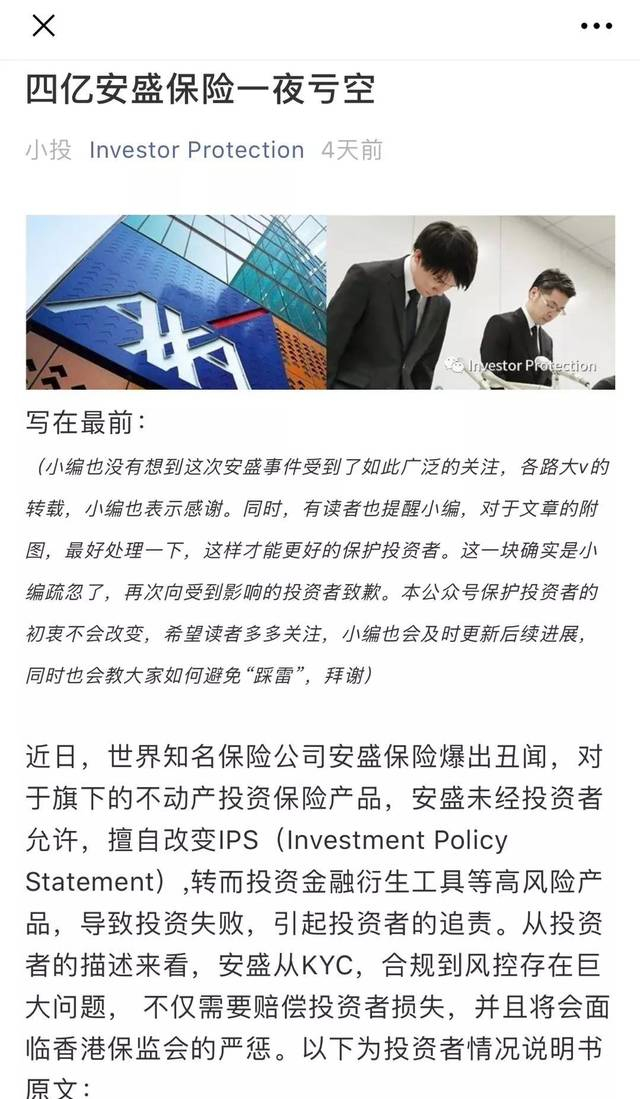 近日,一篇名为《四亿安盛保险一夜亏空》的公开信迅速被广泛传播。这使得“百年保险老店”陷入信任危机,更导致不明所以者很是恐慌,以为香港保险出现了什么问题。那么事实到底如何?安盛保险对于此事到底有没有责任?赴港买保险还“靠谱”吗?