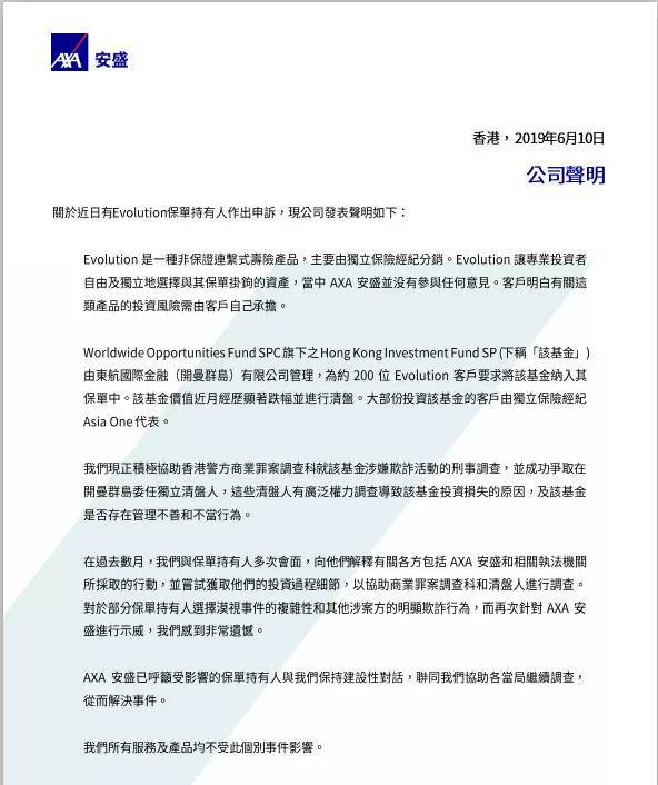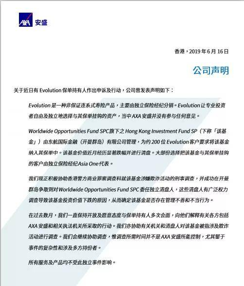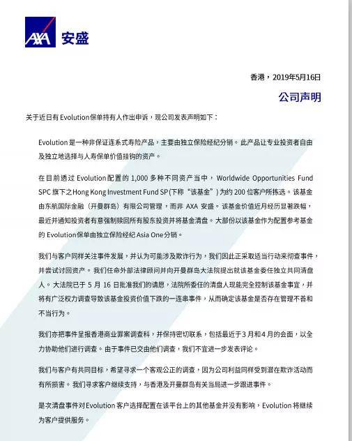 3)这个基金很有可能涉及欺诈活动,安盛已经请求香港警方介入;