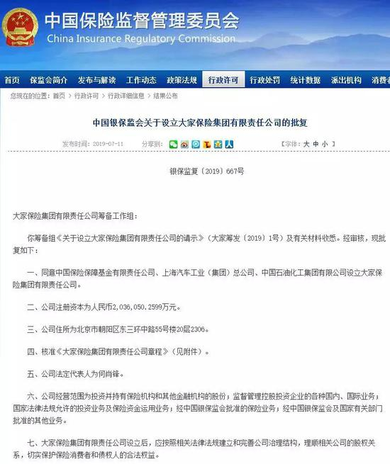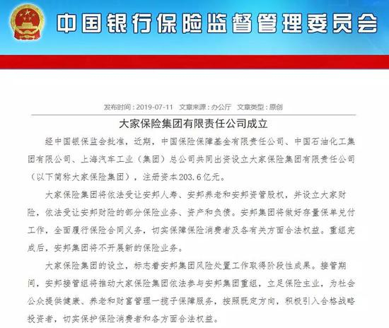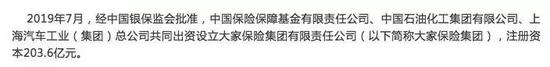 7月11日,中国银保监会在官网发布消息,由中国保险保障基金有限责任公司、中国石油化工集团有限公司、上海汽车工业(集团)总公司共同出资设立设立大家保险集团有限责任公司,注册资本203.6亿元,正式宣告这一新的保险主体诞生。