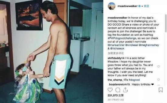 2013年11月30日,正在拍摄《速度与激情7》的保罗•沃克车祸骤逝。在一场车祸引起的爆炸中,年仅40岁的他离开了人世。和普通人一样,他上有年迈的父母、下有年幼的女儿,他的遽然离世对整个家庭都是个巨大的打击。“当我小的时候,你教会我走路、教会我微笑,教会我永不放弃。你是我的英雄,现实世界中的英雄!你离开了我们,但你将永远不会被忘记。愿你安息,爸爸!”16岁的女儿梅朵•沃克含泪写下了悼词。