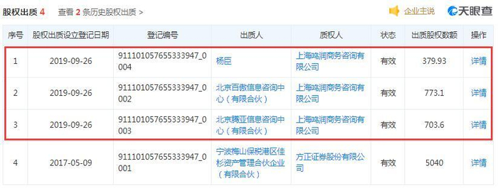 明亚保险经纪董事长杨臣等3股东出质1856.63股权