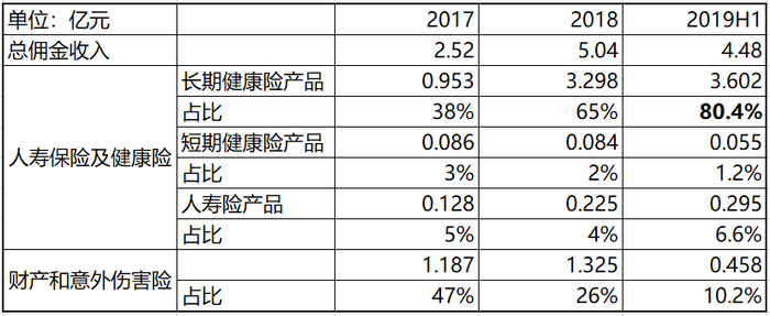 2019年上半年,寿险及长期健康险的收入做到3.9亿元,占总收入的87%。