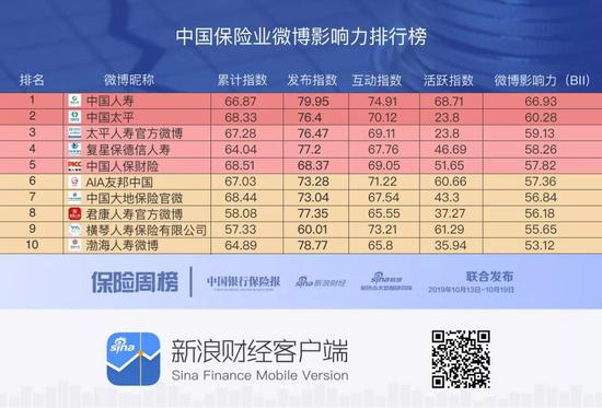 本榜单每周更新,本期榜单监测时间为10月13日-10月19日。榜单将同步在新浪财经官网、新浪金融研究院微信公号,和中国银行保险报微信公众号、中国银行保险报网发布,敬请关注。
