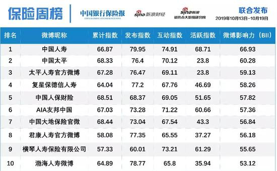 本期榜单显示,中国人寿以66.93的成绩,拿下本期第一名。具体来看,中国人寿的累计指数66.87、发布指数79.95、互动指数74.91、活跃指数68.71。中国太平和太平人寿官方微博分别以60.28和59.13位列第二名和第三名。