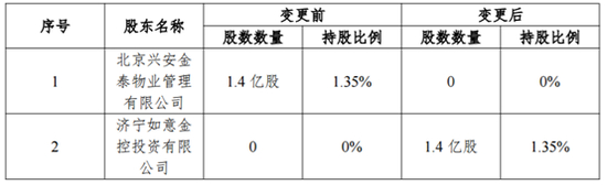 2018年12月,阳光保险集团在中保协官网发布公告称,股东北京兴安金泰物业管理有限公司其持有的1.4 亿股股份转让至济宁如意金控投资有限公司,转让完成后,北京兴安金泰物业将完全退出阳光保险集团,济宁如意金控作为新进股东,持股比例为 1.35%。