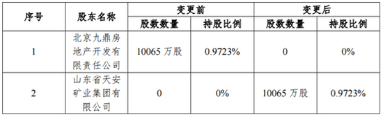 4月7日,阳光保险在中国保险行业协会官网发布公告称,北京九鼎房地产开发有限责任公司将其持有10065万股股份(占比0.9723%)转让至山东省天安矿业集团有限公司(以下简称“天安矿业”)。股权变更后,北京九鼎房地产将完全退出阳光保险集团。