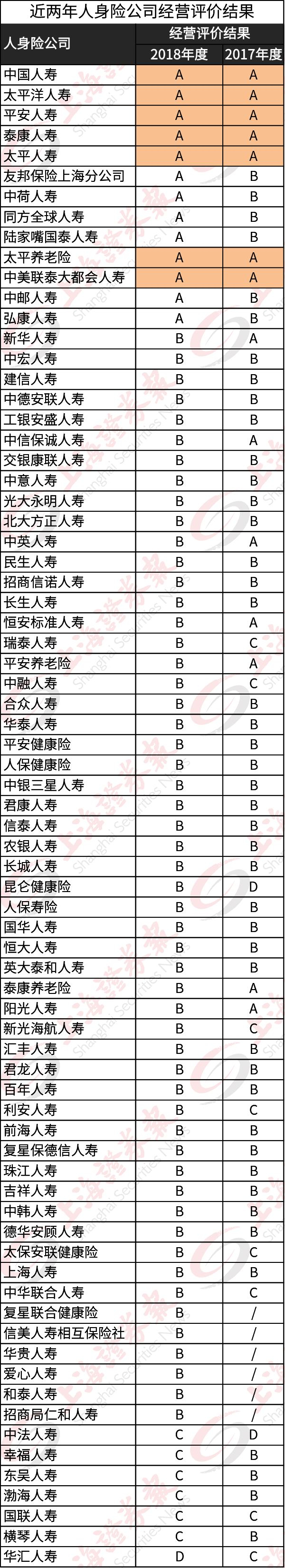 连续两年获得A类评价的人身险公司有7家。分别为:中国人寿、太平洋人寿、平安人寿、泰康人寿、太平人寿、太平养老险、中美联泰大都会人寿。