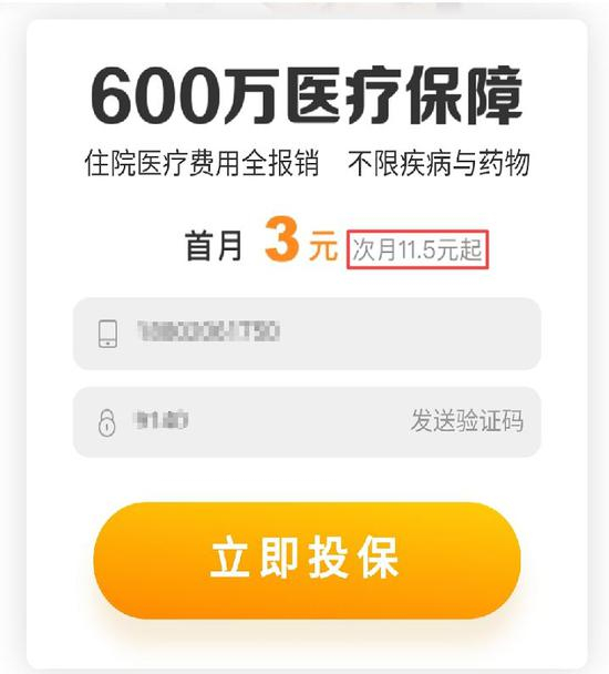 该页面上印着醒目的“3元”和“立即投保”的字样,如果不仔细看,用户很可能会错过灰色小字标出的“次月11.5元起”——实际上这是一款分期支付的保险产品,从次月起按年龄不同,每月需支付11.5月到近百元不等的保费。