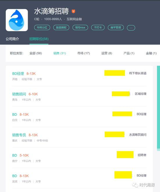 这似乎是水滴筹公司自上而下实行的一项市场策略。在网络招聘平台上,该公司在招职位中存在大量销售、推广以及志愿者岗位,且薪酬明码标价,“月薪过万”并不少见。