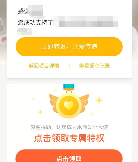 在对水滴筹的测试中我们发现,用户在完成对某众筹项目的捐款后,同样也收到了“恭喜您被选中爱心健康互助金体验用户”,以及点击领取专属特权等推送。
