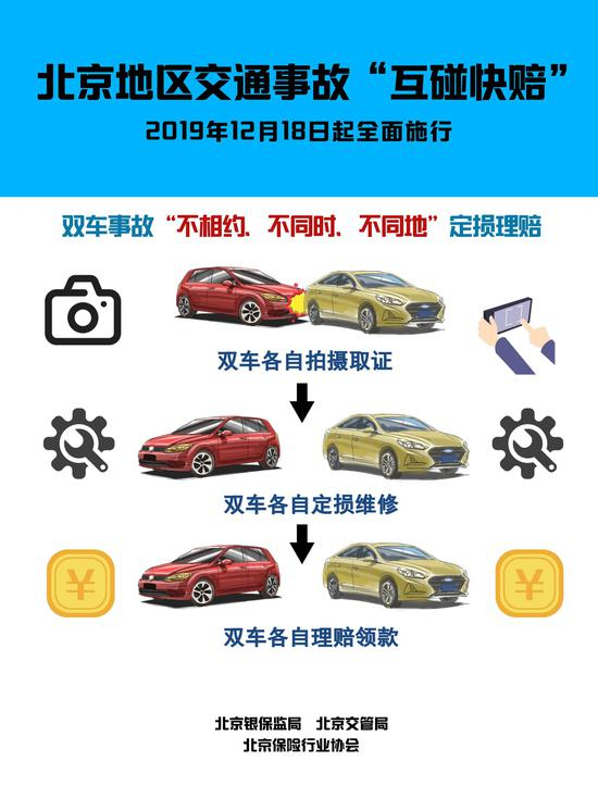 12月18日起,北京地区将率先在全国推出针对交通事故的创新理赔服务模式“互碰快赔”机制。据了解,交通事故“互碰快赔”机制适用于北京地区符合快速处理的双车事故,事故双方一方全责、一方无责。“互碰快赔”机制实现了双车事故当事人分时、分地、分别进行查勘定损以及后期理赔,极大优化事故当事人的理赔流程。