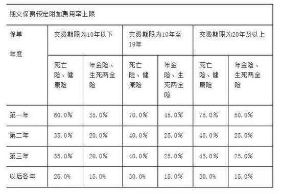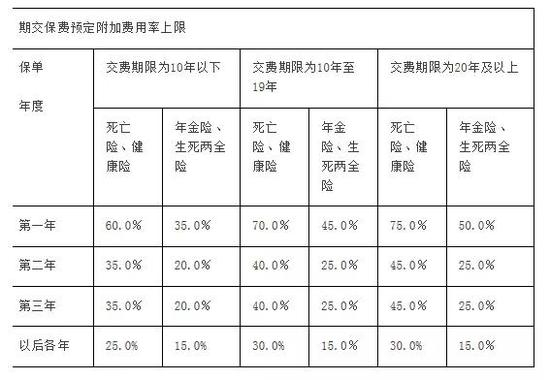(一) 按交费期限的不同,各保单年度预定附加费用率不得超过下表规定的上限: