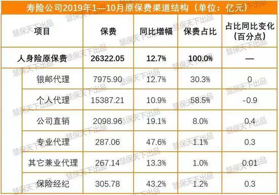 从保费收入来看,更是增长迅猛。以2019年前10月为例,行业整体保费增速仅12.7%,个人代理人渠道、银保渠道更是仅有10.9%、12.7%,但同期,专业代理、保险经纪的保费收入增速却都达到了40%以上。