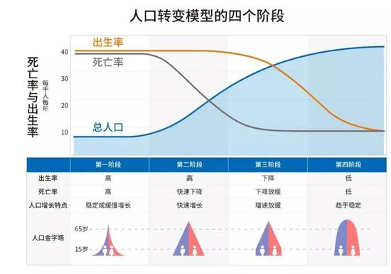 第二阶段是高出生率、死亡率快速下降,人口快速增长。