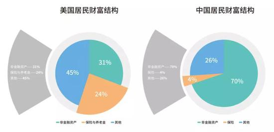 在财富结构上,目前中国人财富70%是非金融资产,基本与房地产挂钩。但是在美国,金融资产占比45%,不动产只占不到1/3。根据目前政府对房地产行业定位来看,未来我国居民财富从房地产向金融资产转移是大趋势。居民的资金涌入资本市场,用投资提高养老金替代率。可以预见,未来中国居民财富结构将会更加分散化。