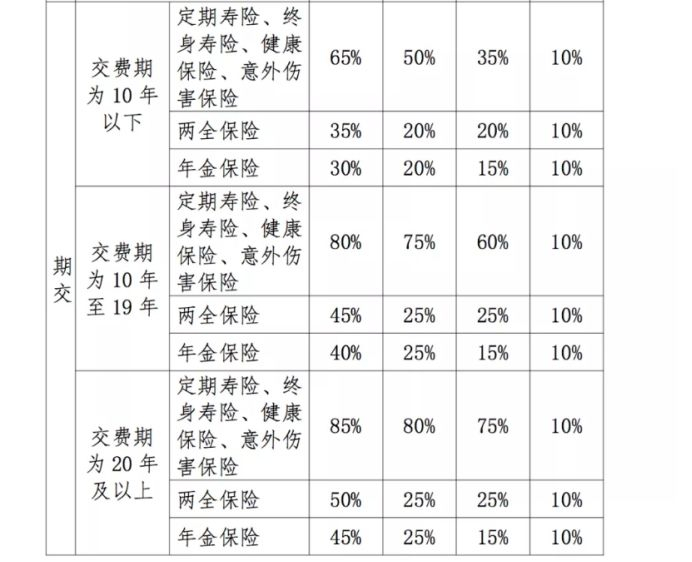 交费期十年以下的,第一年给出的附加费用率上限由60%提至65%,第二年由35%提升至50%,第三年仍为35%;交费期10年至19年的,第一年附加费用率由70%提至80%,第二年由40%上升35个点提至75%,第三年由40%提至60%;交费期20年以上的,第一年由75%提高至80%,第二年由45%提高至80%,第三年由45%提高至75%。