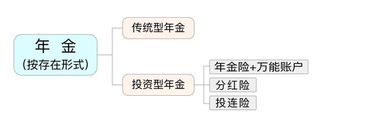 此外,年金险还有两种不同的存在形式:传统型年金险或投资型年金险。而在投资型年金险种,有分有:“年金险+万能账户”、“分红险”、“投连险”。