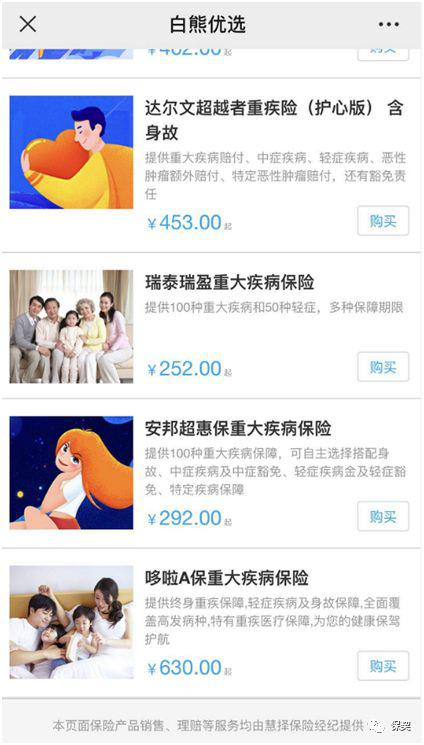 从“白熊保”公众号菜单栏页面的“白熊优选”进入后,跳转页面有各类险种的产品可直接购买,但页面底部却重点提示:“本页面保险产品销售、理赔等服务均由慧择保险经纪提供。”