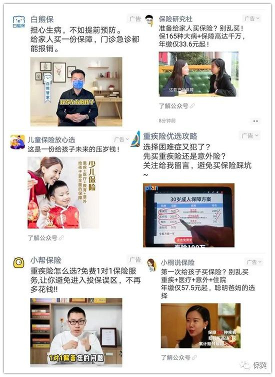 在陆敏纲刚开启直播首秀的时刻,一大批教人挑选保险的测评类、顾问类微信公众号广告悄然在朋友圈刷屏。广告语极具诱惑,且针对性极强,——或儿童保险或重疾保险。样样直指疫情中公众的痛点。