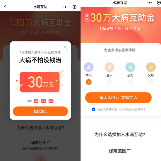 打开水滴互助小程序,就能看到“最高30万大病互助金,104475205会员的选择”,“每人0.01元立即加入。”