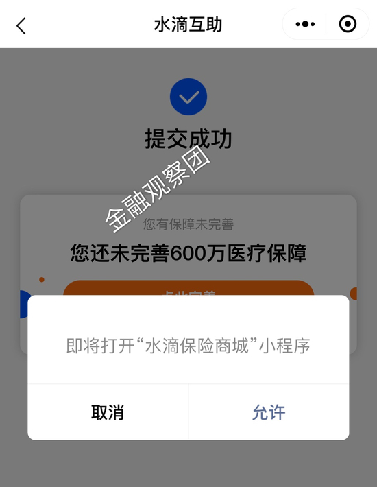 更有意思的是,在发稿前我又测试了两次,页面显示信息提交成功,“您的所有互助计划都已确认“,但是仍未通过验证。点击确认后,页面出现了“您还未完善600万医疗保障“,点击之后即显示跳转到水滴保险商城,显示为安心财险的购保页面。