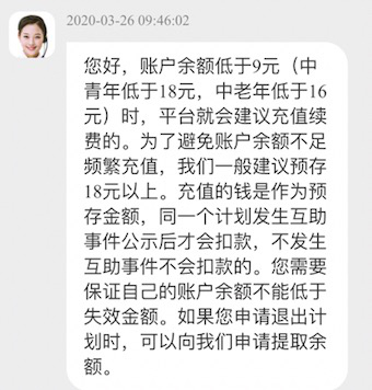那么,该充多少钱呢?水滴公司客服表示,中青年账户余额低于18元就建议充值续费。而根据以往数据,中青年大病互助计划每月分摊金额约为15元。选择自动续费的话,每个月自动扣10元。