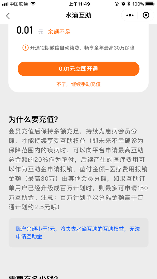 说实话,大部分用户都是看到“0.01元加入最高可获30万大病互助金”才选择加入的,然而加入之后却要继续进行更大金额的充值操作才能获得真正的保障。而在充值0.01元之前,水滴公司并没有提前告知需要进一步续费才能享受保障。