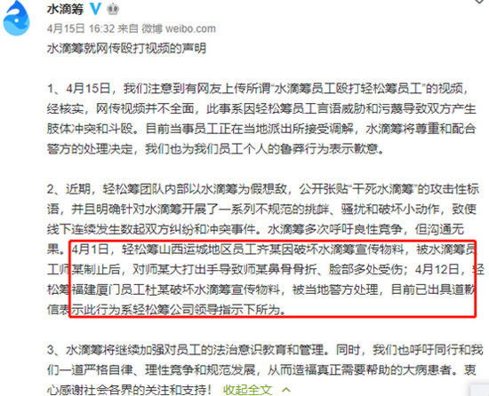 随后,4月15日水滴筹方面发布声明,此事系因轻松筹员工言语威胁和污蔑导致双方产生肢体冲突和斗殴。目前当事员工正在当地派出所接受调解,水滴筹将尊重和配合警方的处理决定,我们也为我们员工个人的鲁莽行为表示歉意。”