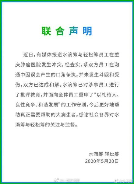 水滴筹轻松筹就员工互殴事件联合声明:已达成和解