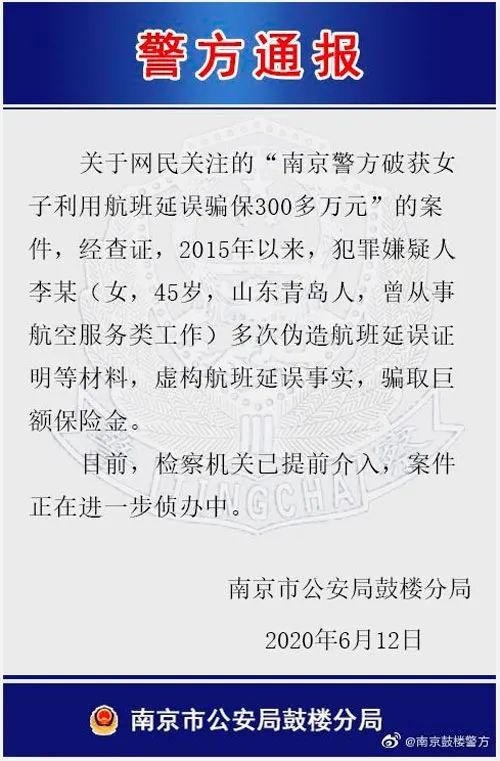 刚刚,南京警方披露了更多细节。根据警方通报,李某并不仅仅如网上讨论,通过猜对延误航班获得理赔,而是存在多次伪造航班延误证明等材料,虚构航班延误事实,骗取巨额保险金等情况。