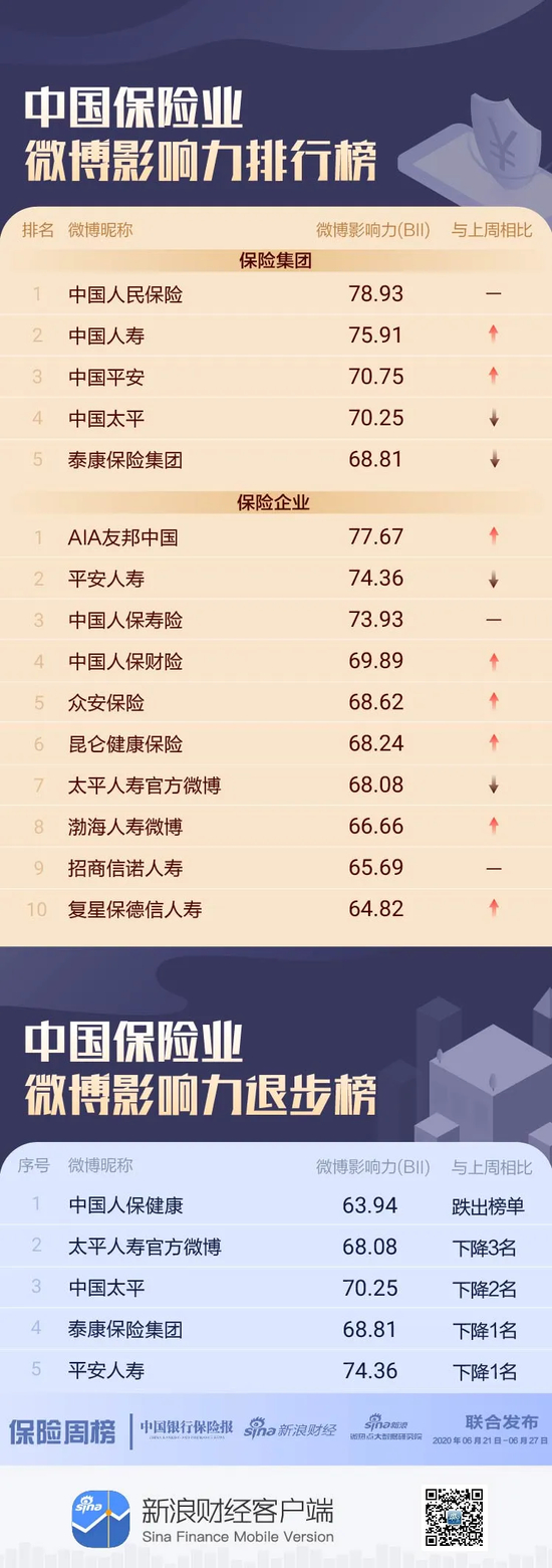 本期榜单监测时间为06月21日-06月27日。综合来看,保险集团方面,中国人民保险位居榜首;中国人寿上升1位;中国平安排名第三。保险企业方面,AIA友邦中国拿下冠军;平安人寿排名第二;中国人保寿险排名第三;渤海人寿上升2位;中国人保健康无缘周榜前十位。