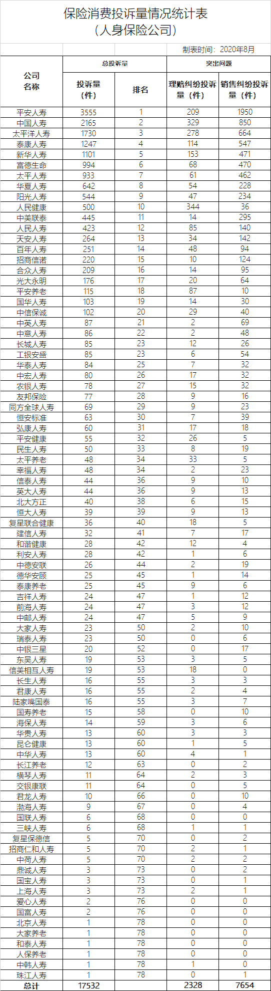总体来看,平安人寿、中国人寿、太保寿险的投诉量位列人身保险公司前三名。其中,平安人寿3555件,同比增长30.36%;中国人寿2165件,同比增长45.20%;太保寿险1730件,同比增长40.54%。