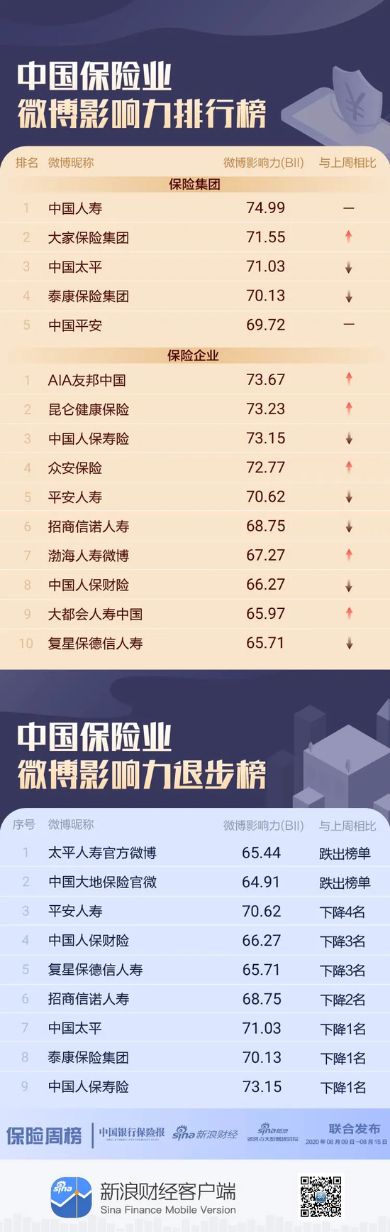 本期榜单监测时间为08月09日-08月15日。综合来看,保险集团方面,中国人寿位居榜首;大家保险集团排名第二;中国太平位列第三。保险企业方面,AIA友邦中国排名上升9位拿下冠军;昆仑健康保险排名第二;中国人保寿险排名第三;众安保险上升10位;平安人寿下降4名。此外,太平人寿和中国大地保险跌出前十。