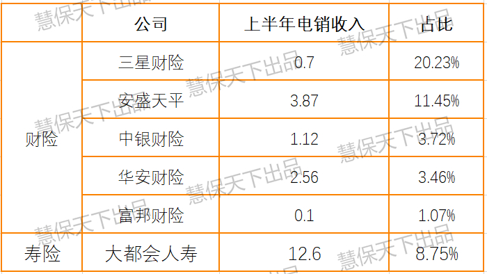 此外,“慧保天下”据相关数据整理,2020年上半年,财险及寿险公司中,电销收入占比较高的公司共有6家(如下图)。此外,招商信诺总经理兼首席执行官赖军在接受媒体采访时表示,公司八千多名员工中,有五千人在做电销,甚至没有个险渠道。而从绝对规模看,平安产险上半年电销渠道收入25亿元,也是妥妥的大户。