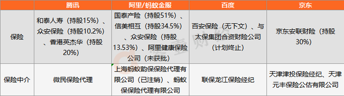 在BATJ四家公司中,除了百度暂未获得保险牌照而只有中介牌照之外,腾讯、阿里和京东都拥有保险和保险中介牌照。