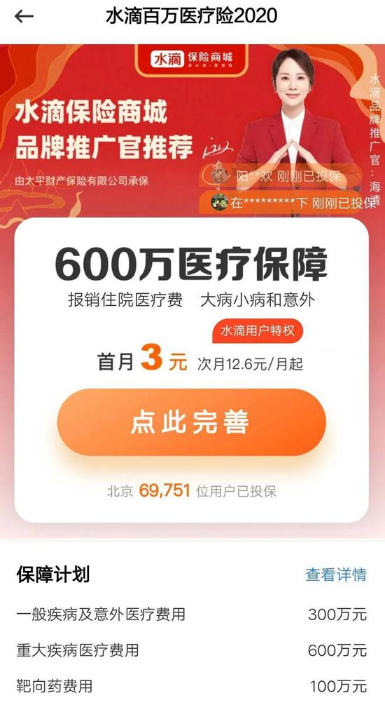 她同样是在抖音上刷到水滴广告的。“推荐的是百万医疗险,写的是首月3元,优惠后1元,次月12.9元起。”