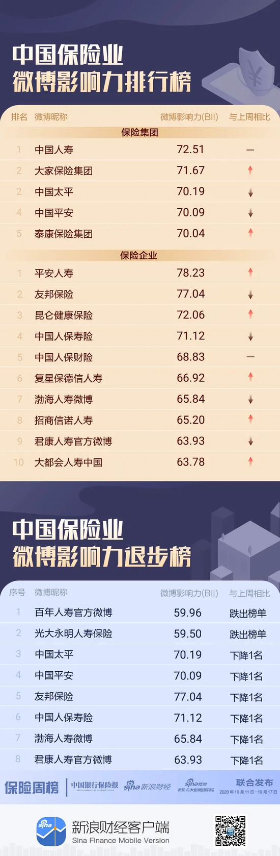 本期榜单监测时间为10月11日-10月17日。综合来看,保险集团方面,中国人寿位居榜首;大家保险集团排名第二;中国太平位列第三。保险企业方面,平安人寿拿下冠军;友邦保险排名第二;昆仑健康保险排名第三;大都会人寿中国重回榜单前十;百年人寿官方微博和光大永明人寿保险无缘前十。