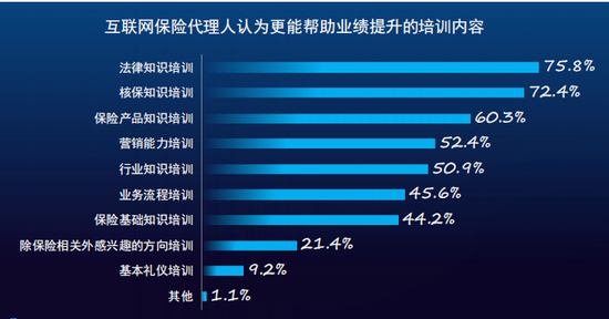 职业培训方面,互联网保险代理人关注培训内容均衡化全面化法律知识培训、核保知识培训成为互联网保险代理人最希望增加的培训内容。