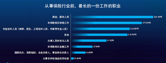 同时,调查结果显示,互联网保险代理人吸引了更多职业类型的人加入,工作背景呈现多元化。从事保险行业前,互联网保险代理人最长的一份工作的职业最多的为商业、服务业人员(占总体的22.4%)、其次为非保险相关销售人员(占总体的19.3%)以及专业技术人员(占总体的16%)。