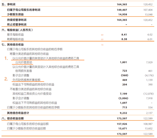 在金融行业,其他综合收益主要包括了一些将公允价值变动反映于其他综合收益而不是直接计入利润表的债权类金融资产(即“FVTOCI”金融资产,英文全名是Fair Value to Other Comprehensive Income)的公允价值变动,也包括了境外子公司的外币报表折算差额等。