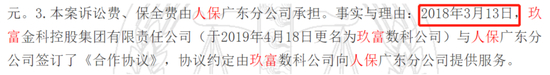 裁定书显示,2018年3月13日,人保广东分公司与玖富数科科技集团有限责任公司(下称“玖富数科”)签订合作协议,协议约定由玖富数科向人保广东分公司提供服务,此后又两次签订补充协议进一步约定了合作内容。该签约时间与银保监会通报相一致。