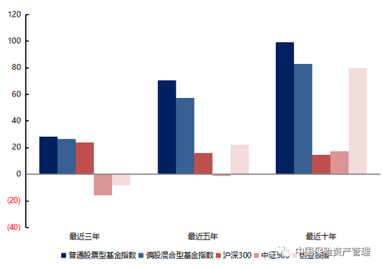 我们以代表主动基金平均水平的Wind普通股票基金型指数、偏股混合型基金指数作为基金业绩的参考。自2004年以来16个年度里,两类基金年化收益率分别为15.72%和13.89%,可以满足大部分保险机构的绝对收益目标。与主要股票市场指数相比,无论是近三年、近五年还是近十年,期间收益率都超越了指数。分年度看,基金在市场下跌阶段跌幅较少,在市场分化阶段均可取得正收益,仅在市场极端上涨阶段可能落后于指数,收益率表现出相对市场更为平稳的特征。上述数据可以表明,从长期范围内的收益与风险两个维度,基金均体现了较好的专业能力(见图1)。