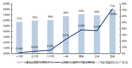 管理规模也是影响基金业绩表现的环境因素,通过调研可以了解到基金的最新规模。由于小规模基金交易成本低、新股增厚多,在投资管理上相对容易。如图5显示,对于同一管理人手下管理的多只权益基金,在相同管理策略、操作思路下,小规模基金相对大规模基金业绩具备优势,并且这种优势随着时间拉长而持续扩大,说明基金规模对基金业绩的影响具有持续性。