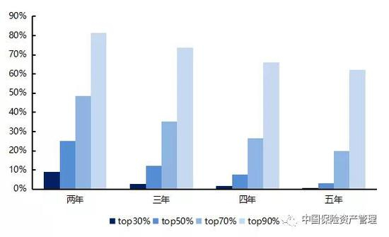 从历史数据来看,真正做到持续战胜同业的基金屈指可数,以过去5年维度看,每年年均排名同业前70%的基金仅占基金比例的20%,每年年均排名前50%的基金更是只有不到3.2%。长期业绩优异的基金,往往不是短期排名连续靠前,反而是每年业绩都不会明显落后的基金,所以业绩的稳定性远比爆发性更难能可贵(见图3)。
