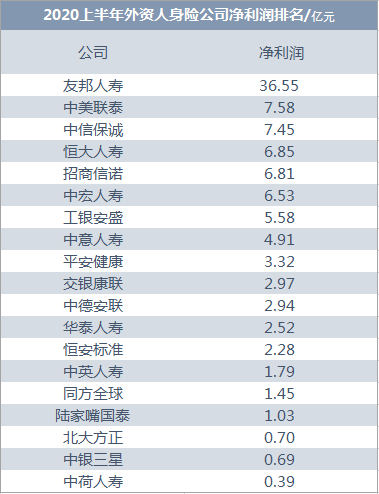 此外,2019年《今日保》曾以亿元保费对相应的净利润做过一张效率榜单,寿险前二十名中,外资占据6成。对比2020上半年外资人身险公司与老六家人身险公司的效率榜单,这一点当更明显。